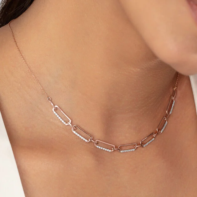 This is the synonym of main character energy, but in a jewellery form. Crafted in 14KT rose gold with diamonds studded in the lower line, the chained silhouette choker necklace features a sleek paper clip chain design that speaks volumes in a whisper.